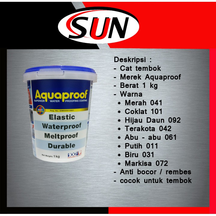 Aquaproof merupakan cat pelapis anti bocor berbahan dasar polimer yang kedap air sehingga menghambat air masuk ke dalam pori pori bidang yang diaplikasikan Tahan Lama Dengan aplikasi yang sesuai dengan instruksi lapisan Aquaproof dapat bertahan sampai dengan 5 tahun